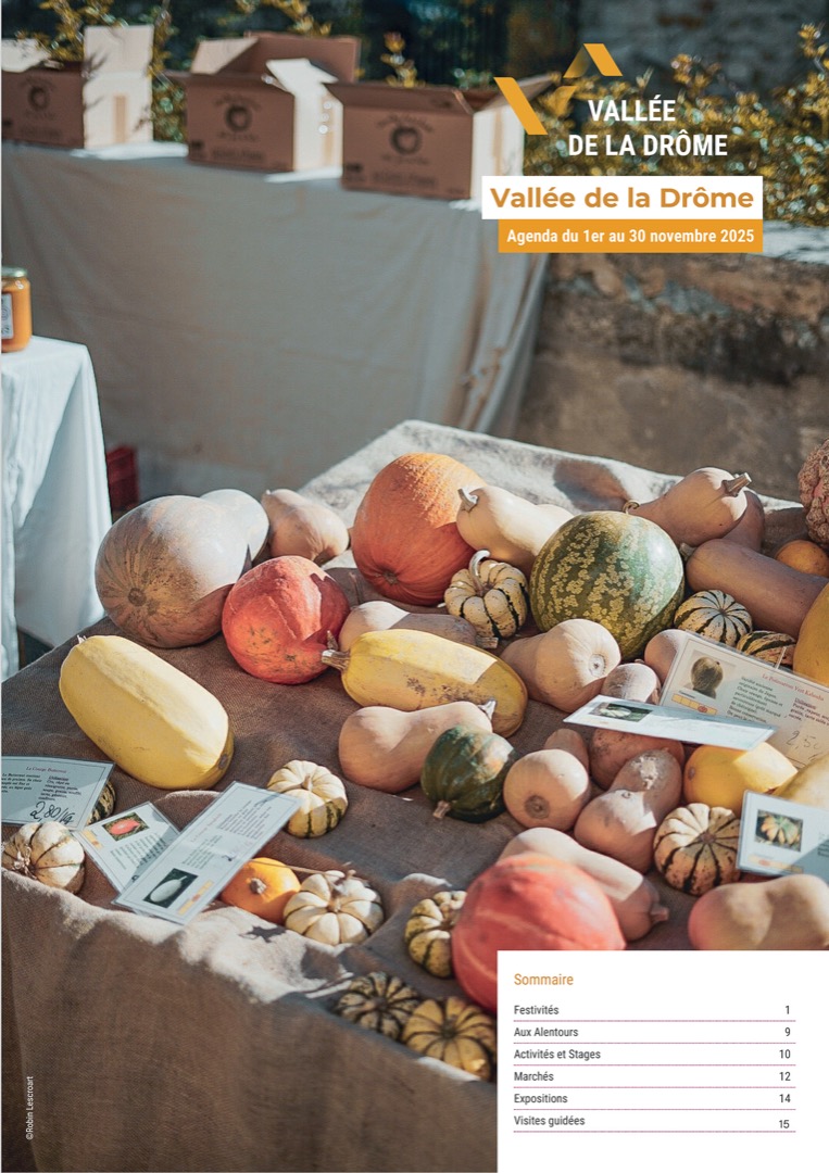 01/11 au 30/11- Agenda vallée de la Drôme Par Annie|2025-10-31T13:46:00+01:0031 octobre 2025|ACTUALITES|Commentaires fermés sur 01/11 au 30/11- Agenda vallée de la Drôme L’agenda du 1er au 30 novembre 2025 Télécharger l’agenda en version PDF Retrouvez dans cette newsletter l’agenda du moment pour préparer vos sorties dans la Vallée de la Drôme : “les expositions, les festivités culturelles, les marchés, les activités nature mais aussi les visites guidées”. Bonne lecture ! L’agenda sur le site internet Pour faire apparaître votre événement dans l’agenda des festivités, c’est simple rendez-vous ici : Saisir son événement en ligne Suivez-nous sur les réseaux sociaux Partager cette page FacebookXRedditLinkedInTumblrPinterestVkEmail