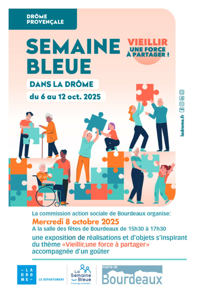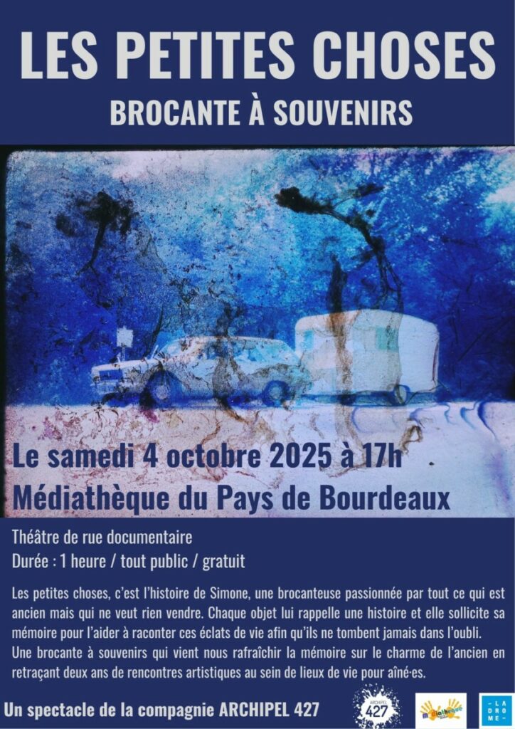 Samedi 8 octobre, le spectacle documentaire Les petites choses sera joué à la médiathèque de Bourdeaux. Le mercredi 8 octobre, une exposition et un goûter intergénérationnel auront lieu à la salle des fêtes.