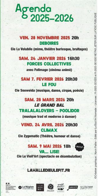2026 – Saison culturelle – La Halle – Dieulefit Par Sylvie|2025-12-27T11:19:19+01:0027 décembre 2025|ACTUALITES, Autres spectacles et animations, CULTURE ET PARTAGE, Lecture - Musique - Théâtre - Multimédia|Commentaires fermés sur 2026 – Saison culturelle – La Halle – Dieulefit Voir la programmation en détail Partager cette page FacebookXRedditLinkedInTumblrPinterestVkEmail