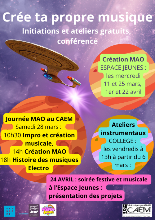 Les événements du 28 mars s’inscrivent dans le cadre d’un projet musical autour de la création et des musiques électroniques mené par le CAEM avec les collégiens et soutenu par le Département de la Drôme dans le cadre de l’appel à projets « Publics et pratiques artistiques ».