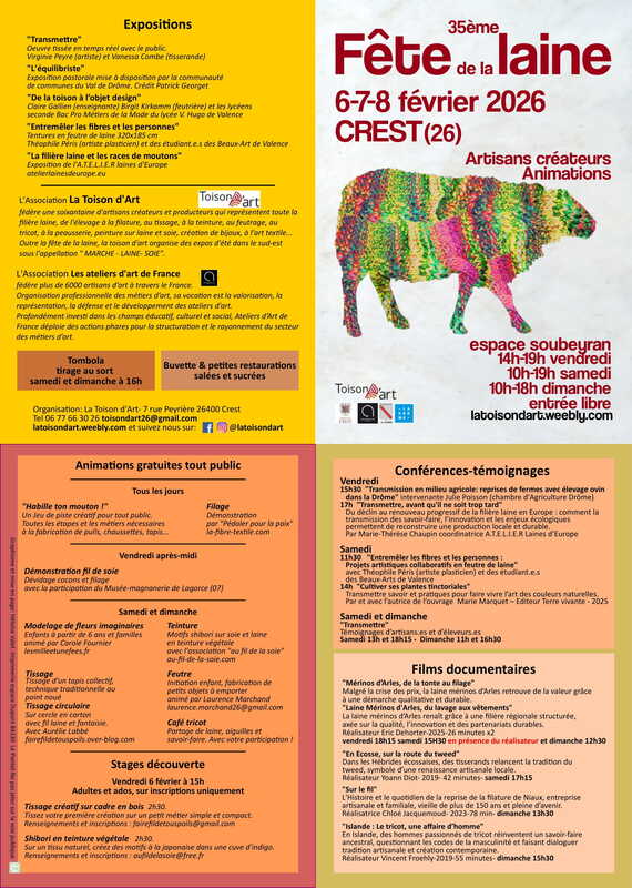 6-7-8/02 35ème Fête de la LAINE- Crest Par JAC|2026-01-30T09:39:25+01:0030 janvier 2026|ACTUALITES|Commentaires fermés sur 6-7-8/02 35ème Fête de la LAINE- Crest Fête de la Laine – 35è édition Espace Soubeyran 75 av. Jean Rabot 26400 Crest Toutes les infos là Partager cette page FacebookXRedditLinkedInTumblrPinterestVkEmail