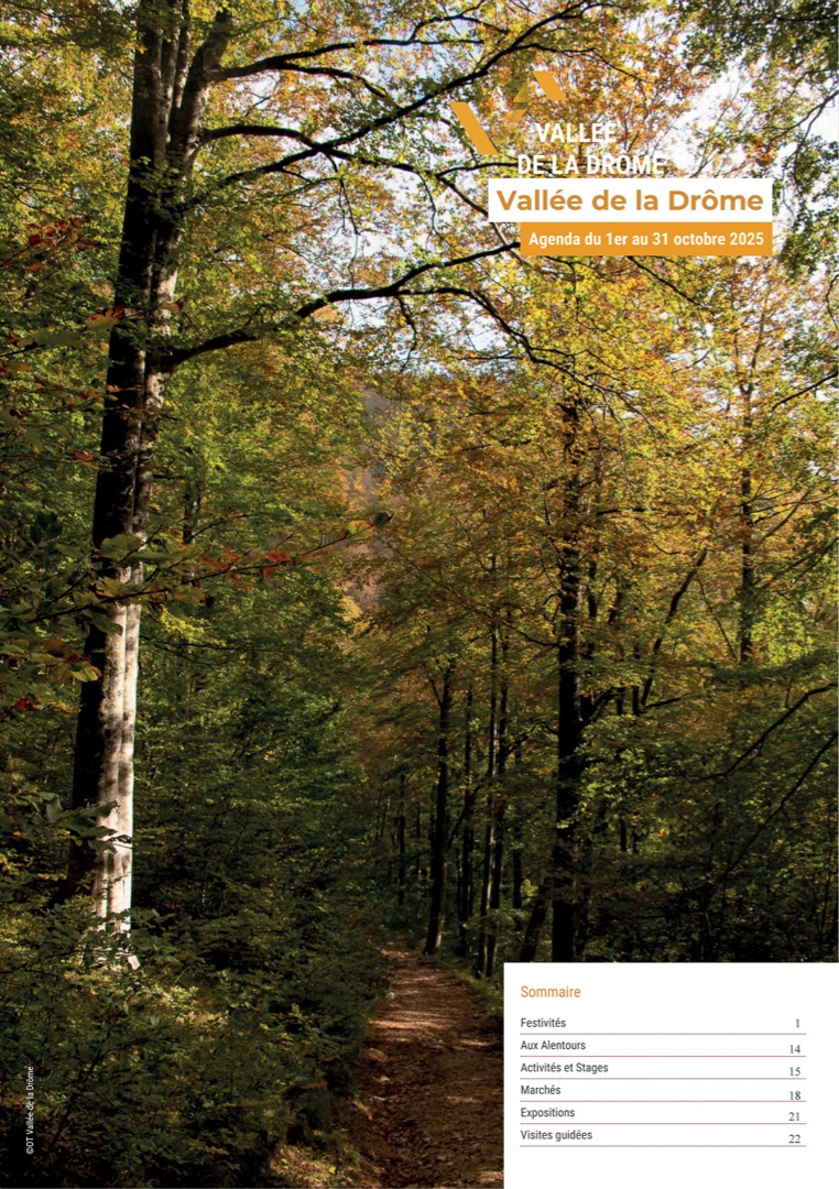 Agenda du mois d’octobre- Vallée de la Drôme. Par Annie|2025-10-01T14:38:58+02:001 octobre 2025|ACTUALITES|Commentaires fermés sur Agenda du mois d’octobre- Vallée de la Drôme. L’agenda du 1er au 31 octobre 2025 Télécharger l’agenda en version PDF Retrouvez dans cette newsletter l’agenda du moment pour préparer vos sorties dans la Vallée de la Drôme : “les expositions, les festivités culturelles, les marchés, les activités nature mais aussi les visites guidées”. Bonne lecture ! L’agenda sur le site internet Pour faire apparaître votre événement dans l’agenda des festivités, c’est simple rendez-vous ici : Saisir son événement en ligne Suivez-nous sur les réseaux sociaux Partager cette page FacebookXRedditLinkedInTumblrPinterestVkEmail