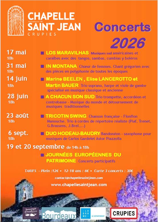 La Chapelle Saint Jean – Saison 2026 – Crupies Par Sylvie|2026-04-29T09:07:38+02:0029 avril 2026|ACTUALITES, Autour des associations et clubs, PROGRAMMES DE LA SAISON|Commentaires fermés sur La Chapelle Saint Jean – Saison 2026 – Crupies Voici le tout nouveau programme ! En savoir plus sur le site. Partager cette page FacebookXRedditLinkedInTumblrPinterestVkEmail