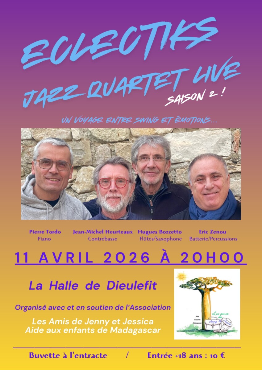L’association” Les Amis de jenny et Jessica aide aux enfants de Madagascar” organise une grande soirée de soutien le 11 avril à 20h à la Halle avec le groupe Eclectiks , le trio s’est agrandi : le quartet propose un voyage original pour swinguer avec fraicheur et bonne humeur . Buffet, buvette, entrée 10 euros, gratuit moins de 18 ans.