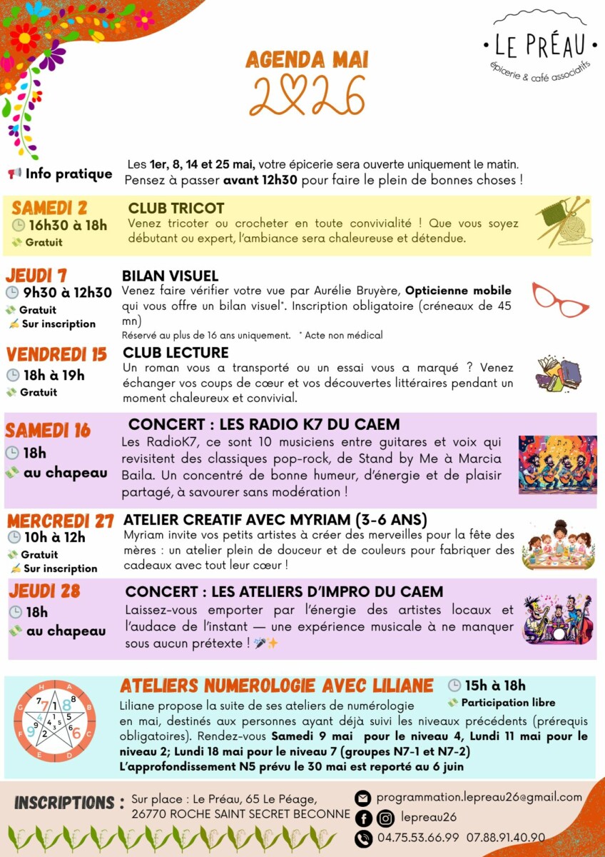 Programme du mois de Mai au Préau – La Roche Saint Secret Par JAC|2026-04-23T17:41:24+02:0023 avril 2026|ACTUALITES, Autour des associations et clubs, LES ASSOCIATIONS ET CLUBS|Commentaires fermés sur Programme du mois de Mai au Préau – La Roche Saint Secret Toute l’info du mois sur la lettre de mai : ICI Mais déjà l’agenda : Partager cette page FacebookXRedditLinkedInTumblrPinterestVkEmail