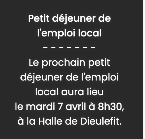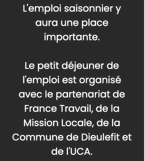 7/04 Petit déjeuner de l’emploi – Dieulefit Par JAC|2026-03-09T19:05:08+01:009 mars 2026|MAIRIES - OT - COM. de COMMUNES, Recherche d'emploi, Stages - Formations|Commentaires fermés sur 7/04 Petit déjeuner de l’emploi – Dieulefit Partager cette page FacebookXRedditLinkedInTumblrPinterestVkEmail