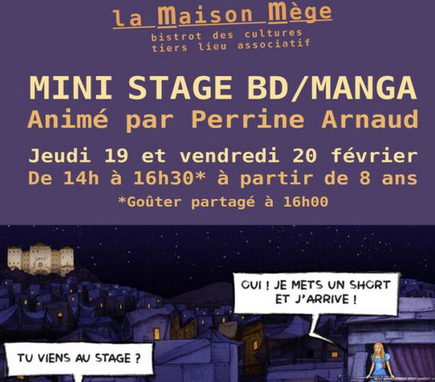 MINI STAGE DE BD ET MANGA à la Maison Mège. - Jeudi 19 et vendredi 20 février de 14h à 16h30. -15€ / demi journée 25€ / 2 demi journées - Ouvert à tous à partir de 8 ans. - Places limitées . Merci de réserver. Plus d'infos: 06.82.87.46.09 https://www.perrinearnaud.fr/cours-stagesbd