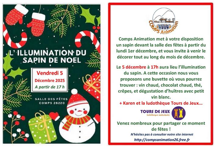 CompsVendredi 5 décembre: soirée de Noël, avec Comps Animation qui vous propose huîtres et autres gourmandises, sans oublier la bonne humeur (pas de CB)