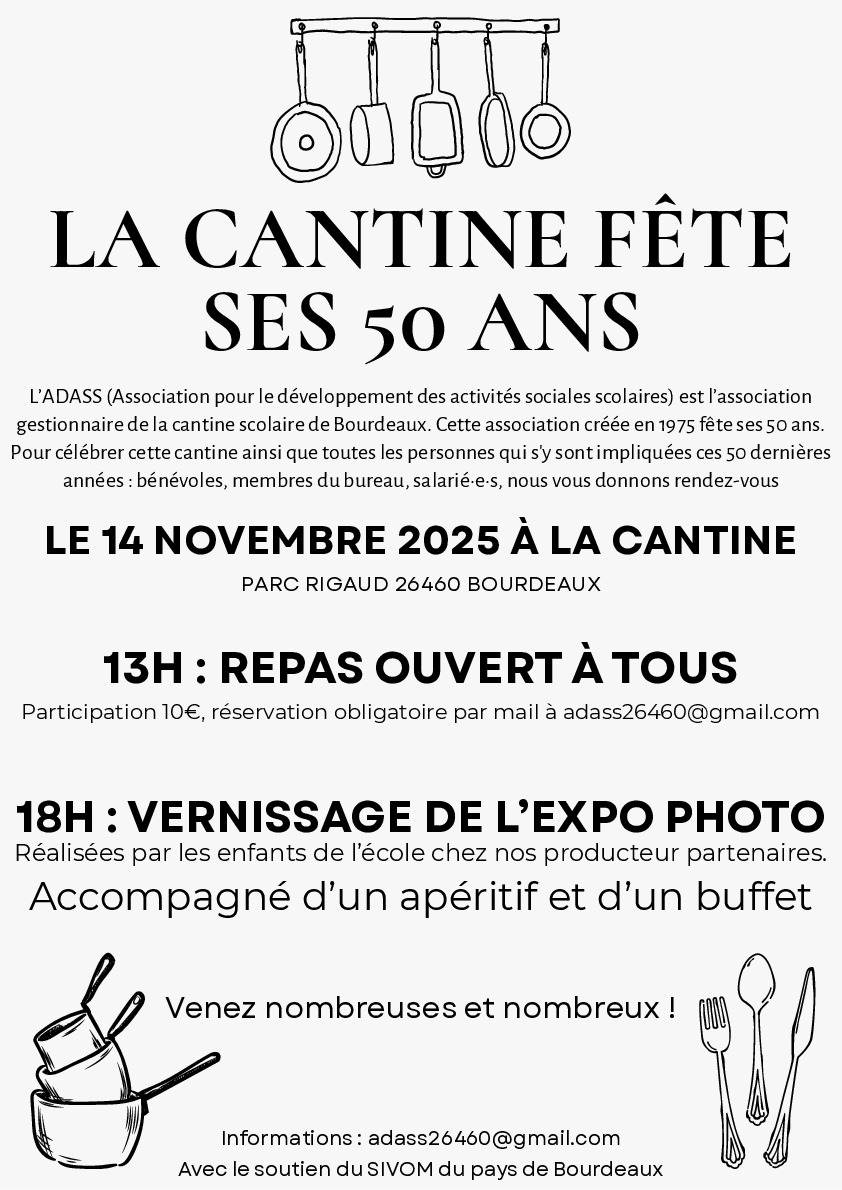 Pour célébrer cette cantine ainsi que toutes les personnes qui s’y sont impliquées ces 50 dernières années : bénévoles, membres du bureau, salarié·e·s, nous vous donnons rendez-vous le 14 novembre 2025 à la cantine, parc Rigaud, 26460 Bourdeaux.