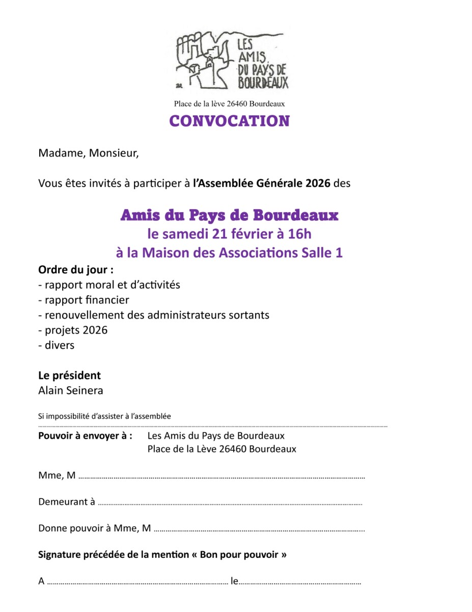 Nous avons le plaisir de vous inviter à l’Assemblée Générale de l’association des Amis du Pays de Bourdeaux qui aura lieu le samedi 21 février à 16 heures à la maison des associations.
