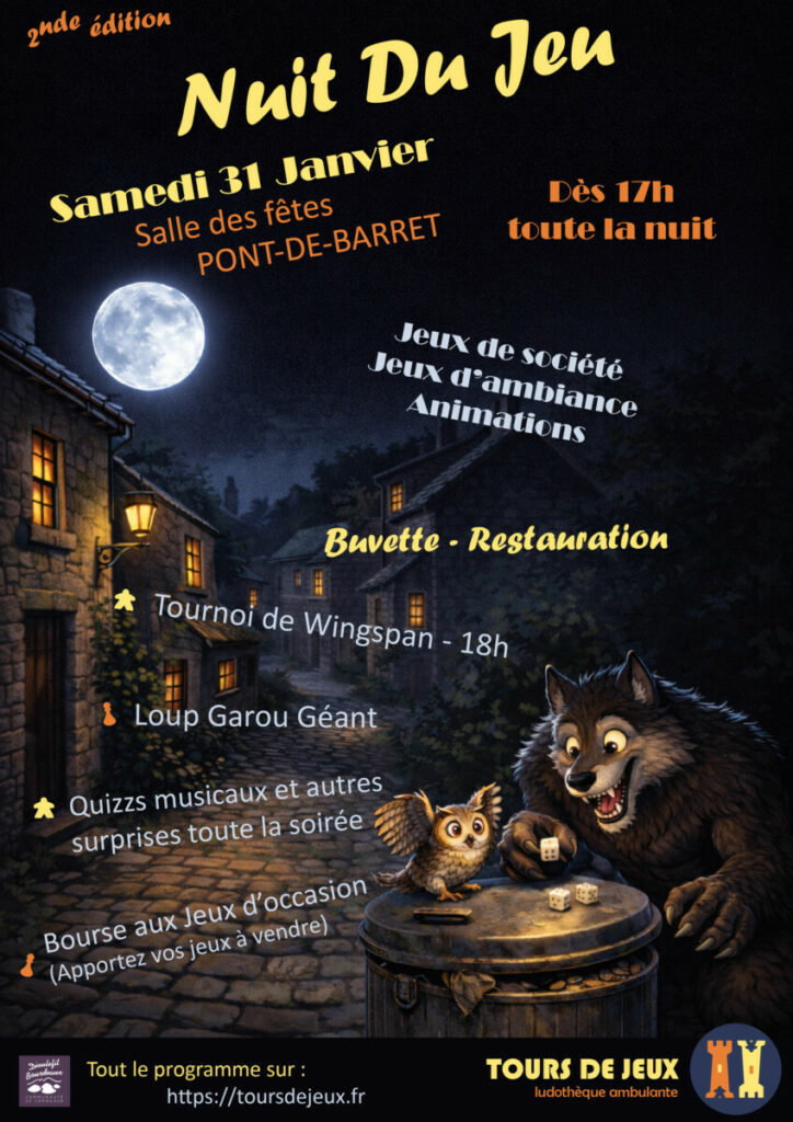 Notre NUIT DU JEU approche à pas de “Loup Garou” et s’installera pour touuuuuuute la nuit à Pont de Barret le samedi 31 janvier.
