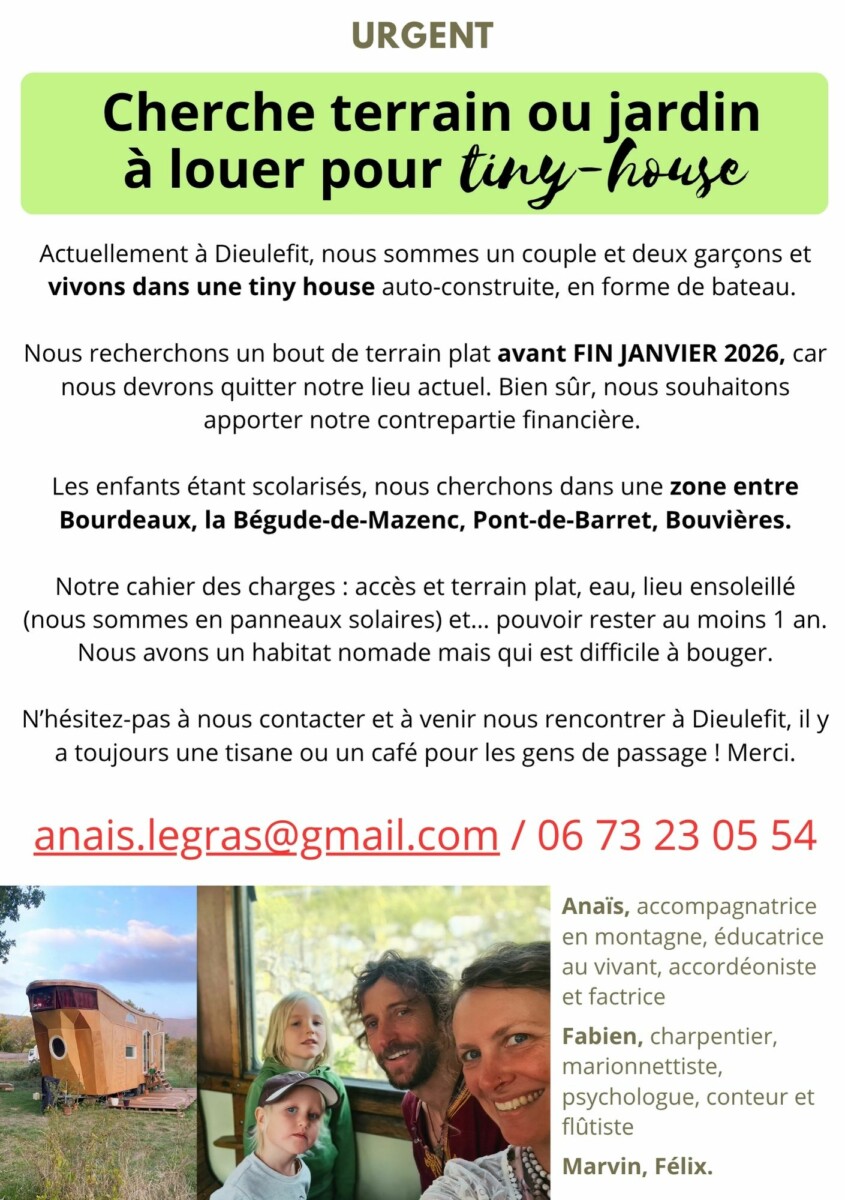 Par AnaisLegras|2025-11-07T17:59:17+01:007 novembre 2025|Annonces - Echanges - Coups de main, Je recherche, L' HABITAT, LA VIE SOCIALE|Commentaires fermés sur Recherche à louer terrain ou jardin pour tiny-house (urgent)