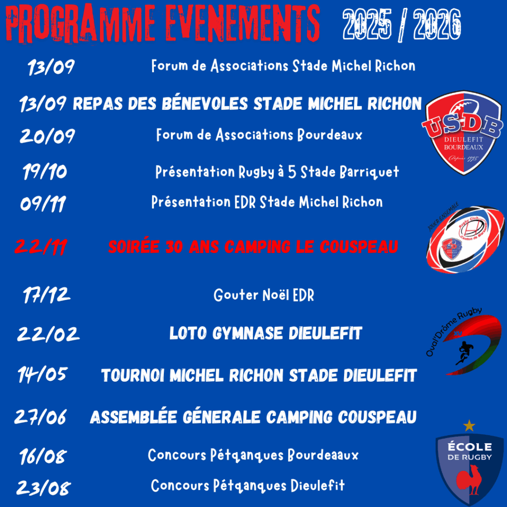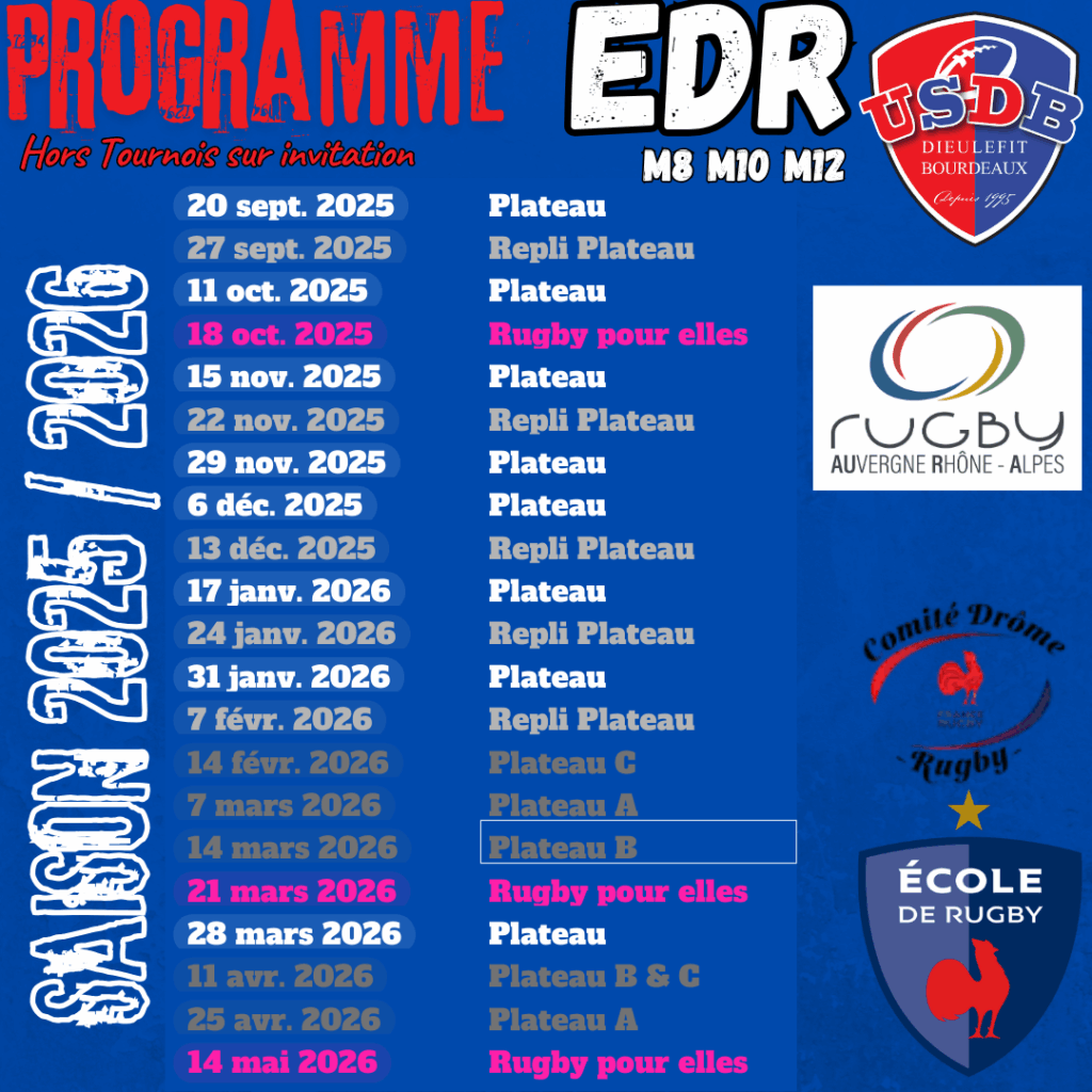 Programme 2025-2026 de l’USDB Rugby Par Gwendoline|2025-09-23T12:30:15+02:0023 septembre 2025|Activités sportives - Actualités, Activités sportives - Liste, Autour des associations et clubs, LES ASSOCIATIONS ET CLUBS, Liste des associations et clubs, PROGRAMMES DE LA SAISON|Commentaires fermés sur Programme 2025-2026 de l’USDB Rugby Partager cette page FacebookXRedditLinkedInTumblrPinterestVkEmail