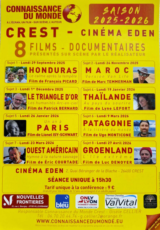 Programme des films et conférences de « Connaissance du Monde » – Crest Par JAC|2026-01-14T21:22:45+01:0014 janvier 2026|Autres spectacles et animations, CULTURE ET PARTAGE, Voyages|Commentaires fermés sur Programme des films et conférences de « Connaissance du Monde » – Crest Lndi 19 Janvier 15H30 La Patagonie Les Infos Partager cette page FacebookXRedditLinkedInTumblrPinterestVkEmail