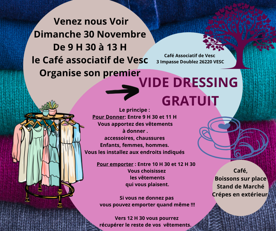 Par cafe associatif vesc|2025-11-19T20:21:53+01:0019 novembre 2025|ANNONCES, Autour des associations et clubs, LES ASSOCIATIONS ET CLUBS|Commentaires fermés sur 30/11 Vide Dressing gratuit – Vesc