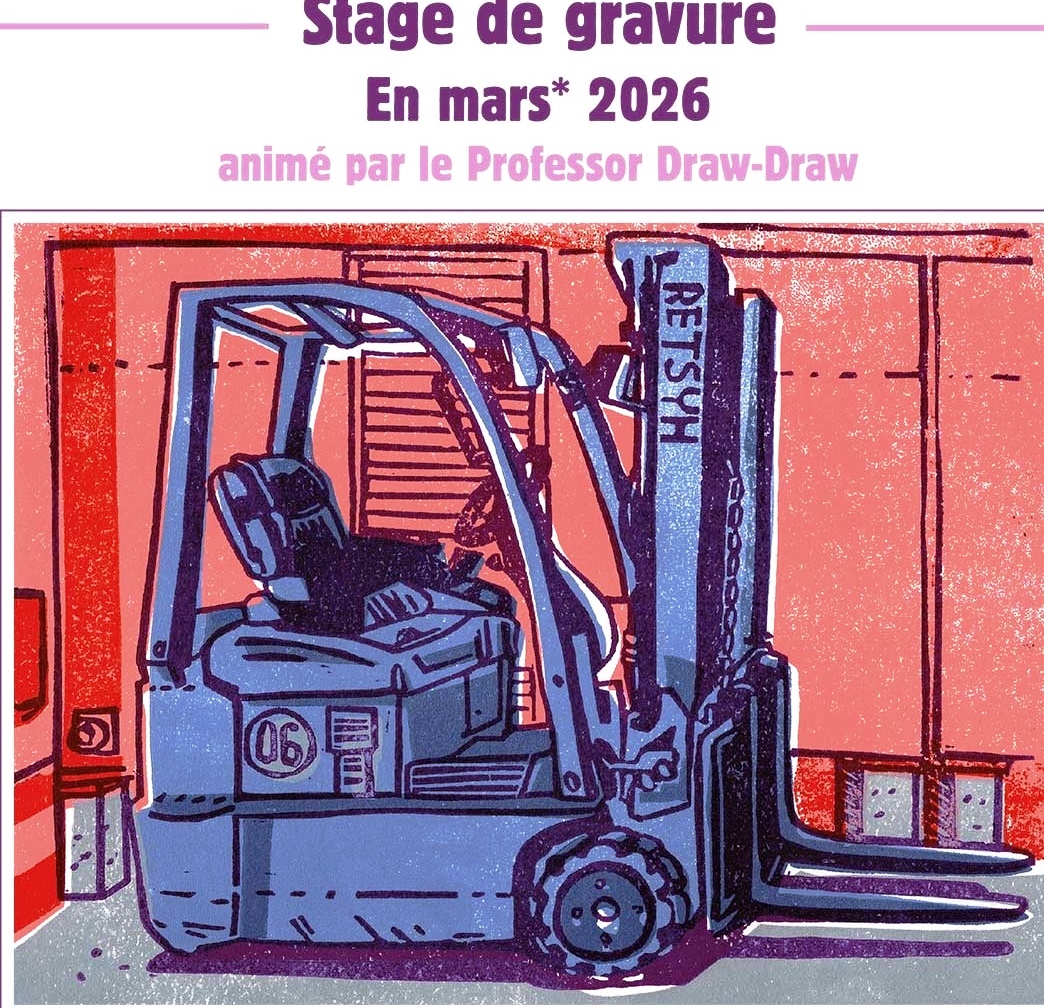 Le Pr. Draw-Draw vous propose son fameux stage de gravure en couleurs. Au programme : Un petit rappel de l'histoire de l'imprimerie en général et de l'estampe en particulier, un peu de taille-douce quand-même avec le célèbre Lasagnographe, et de la taille d'épargne sur lino, de différentes façons. Le but n'est pas de réaliser un [...]